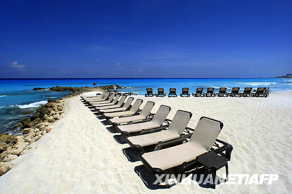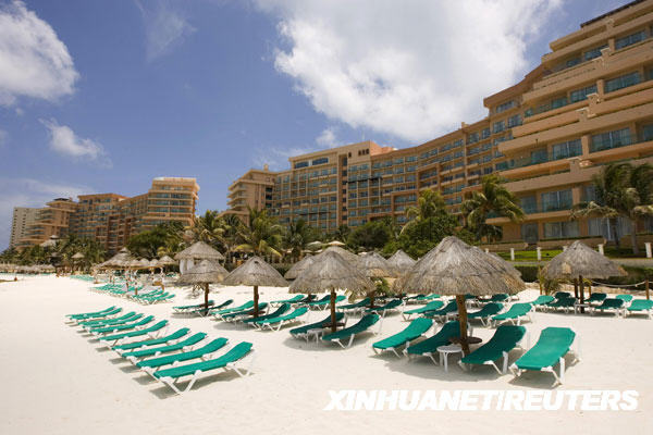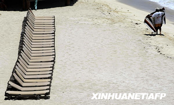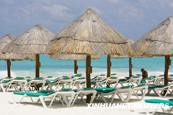5月12日拍攝的照片顯示墨西哥旅游勝地坎昆海灘上見不到一個游客。甲型H1N1流感使墨西哥旅游業(yè)遭受重創(chuàng)。墨西哥地方官員11日說,游客銳減已迫使旅游勝地坎昆等地的25家酒店關(guān)門。墨旅游促進委員會公布最新預測稱,2009年墨西哥旅游業(yè)盈利將比2008年減少近三成。新華社/法新