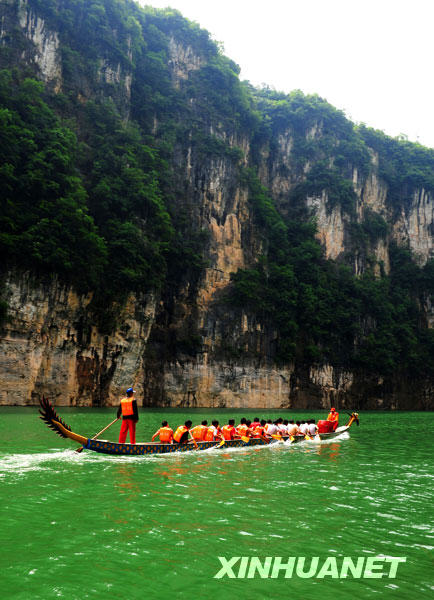 5月17日,一支龍舟在三峽壩前九畹溪水域訓(xùn)練。三峽山崖上水位下降后的消落帶清晰可見。 |