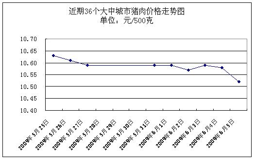 據(jù)國(guó)家發(fā)展改革委價(jià)格監(jiān)測(cè)中心監(jiān)測(cè),2009年5月31日-2009年6月5日全國(guó)36個(gè)大中城市集市、超市豬肉(精瘦肉)平均零售價(jià)格每500克為10.57元,與前一周(2009.5.25-2009.5.27)相比下降0.38%。