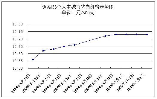 據(jù)國家發(fā)展改革委價格監(jiān)測中心監(jiān)測,上周(2009.6.29-2009.7.3,下同)36個大中城市集市、超市豬肉(精瘦肉)平均零售價格每500克為10.73元,與前一周(2009.6.22-2009.6.26,下同)相比上漲1.04%。