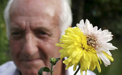 威廉安德伍德向記者展示他所種出的黃白雙色菊花。 據(jù)英國媒體8月23日報道,英國薩?丝ひ晃73歲退休卡車司機威廉安德伍德在自家花園中種出了一株雙色菊花。該菊花為黃白兩色,大小與普通菊花一樣。據(jù)植物學家介紹,出現(xiàn)雙色菊花主要是因為基因突變所致。