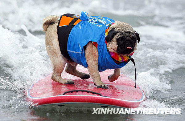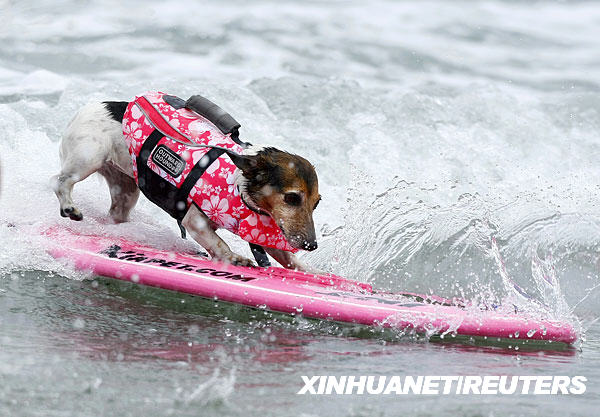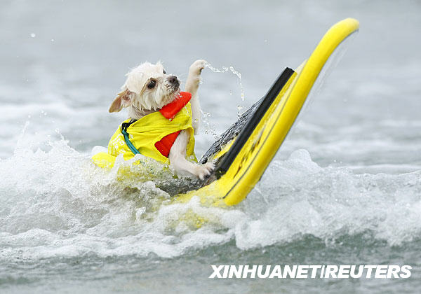 9月13日,在美國加利福尼亞州的德爾馬,一只6歲大的小狗體驗(yàn)沖浪。當(dāng)天,這里舉辦了一場狗狗沖浪大賽,旨在為流浪動物籌集善款并喚起人們對寵物的愛心和責(zé)任感。 |
