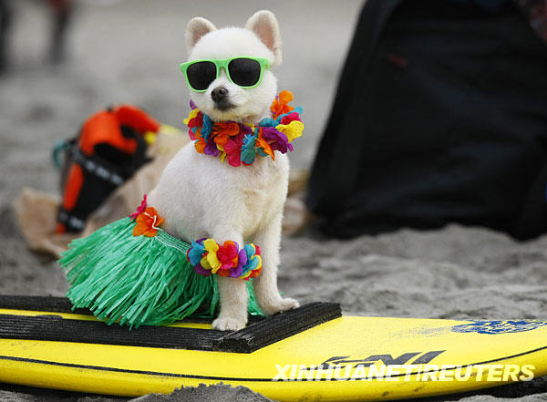 9月13日,在美國加利福尼亞州的德爾馬,一只裝扮入時的小狗等待參加沖浪比賽。當(dāng)天,這里舉辦了一場狗狗沖浪大賽,旨在為流浪動物籌集善款并喚起人們對寵物的愛心和責(zé)任感。
