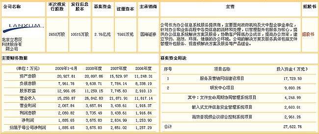 北京立思辰科技股份有限公司主營(yíng)文件管理外包服務(wù),注冊(cè)時(shí)間為1999年1月8日。公司董事長(zhǎng)池燕明90年代初就開始從事復(fù)印相關(guān)的服務(wù)和產(chǎn)品銷售。根據(jù)公開資金顯示,立思辰在2004年之前主要從事復(fù)印機(jī)的代理銷售。 但是由于行業(yè)競(jìng)爭(zhēng)激烈、利潤(rùn)率降低,2004年之后公司借鑒國外文件管理外包的模式,轉(zhuǎn)型做一家服務(wù)性企業(yè)。模式就是企業(yè)將打印服務(wù)業(yè)務(wù)交給專業(yè)的服務(wù)提供商,進(jìn)行"按需打印、按張收費(fèi)",企業(yè)無須購買設(shè)備,而專業(yè)的服務(wù)商通過一系列技術(shù)手段,監(jiān)控所有的設(shè)備,提供全面的設(shè)備運(yùn)營(yíng)管理,幫助企業(yè)節(jié)省費(fèi)用以及提高效率。 招股說明書顯示,公司近年處于快速成長(zhǎng)階段。2006-2008年度營(yíng)業(yè)收入分別為11817萬、21871萬、26842萬,復(fù)合增長(zhǎng)率為50.72%;公司2006-2008年度凈利潤(rùn)分別為1253萬、2694萬、3675萬,復(fù)合增長(zhǎng)率為71.22%。 2009年上半年,公司銷售收入和利潤(rùn)分別為15250萬和1885萬;不過招股說明書為提供08年同期的數(shù)據(jù)。 公司的辦公信息系統(tǒng)解決方案及服務(wù)客戶主要是于政府機(jī)構(gòu)和多個(gè)行業(yè)的大中型企事業(yè)單位。 招股說明書顯示,2009年上半年,公司前五大客戶為內(nèi)蒙庫勞動(dòng)和社會(huì)保障廳、國家統(tǒng)計(jì)與、民生銀行(6.65,-0.11,-1.63%)、中石油(13.18,-0.23,-1.72%)西氣東送管道分公司、北京匯成嘉和科技有限公司,五大客戶占銷售總額的29.48%。 2008年公司的市場(chǎng)占有率為6.1%,居第二的位置,第一位的富士施樂市場(chǎng)占有率為17.04%。