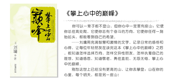 你可以一輩子都不登山,但你心中一定要有座山。它使你總往高處爬,它使你總有個(gè)奮斗的方向,它使你任何一刻抬起頭,都能看到自己的希望。 《攀上心中的巔峰》就是為年輕人寫的。正因?yàn)閷懡o“年輕的你”,所以既把你往回拉,叮囑你好好準(zhǔn)備行囊、接受訓(xùn)練;也把你往外推,告訴你:“你要走自己的路,成為你自己!