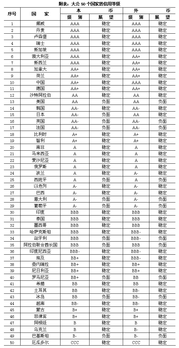 ·指引全球信用風(fēng)險 把握國際評級話語權(quán) ·中國本幣AA+、外幣AAA,美國本幣AA、外幣AA,德國本幣AA+、外幣AA+,日本本幣AA-、外幣AA