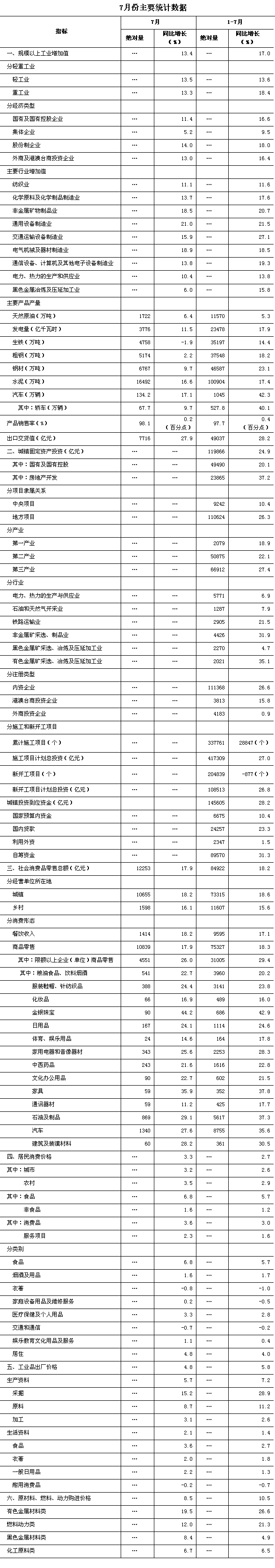 7月份,規(guī)模以上工業(yè)增加值同比增長(zhǎng)13.4%,比6月份回落0.3個(gè)百分點(diǎn);1-7月份,規(guī)模以上工業(yè)增加值同比增長(zhǎng)17.0%,比上半年回落0.6個(gè)百分點(diǎn)。 分經(jīng)濟(jì)類(lèi)型看,7月份,國(guó)有及國(guó)有控股企業(yè)增長(zhǎng)11.4%,集體企業(yè)增長(zhǎng)5.2%,股份制企業(yè)增長(zhǎng)14.0%,外商及港澳臺(tái)投資企業(yè)增長(zhǎng)13.0%。分輕重工業(yè)看,7月份,重工業(yè)增長(zhǎng)13.3%,輕工業(yè)增長(zhǎng)13.5%。 分行業(yè)看,7月份,39個(gè)大類(lèi)行業(yè)全部保持同比增長(zhǎng)。其中,紡織業(yè)增長(zhǎng)11.1%,化學(xué)原料及化學(xué)制品制造業(yè)增長(zhǎng)13.7%,非金屬礦物制品業(yè)增長(zhǎng)18.5%,通用設(shè)備制造業(yè)增長(zhǎng)21.0%,交通運(yùn)輸設(shè)備制造業(yè)增長(zhǎng)15.9%,電氣機(jī)械及器材制造業(yè)增長(zhǎng)18.9%,通信設(shè)備、計(jì)算機(jī)及其他電子設(shè)備制造業(yè)增長(zhǎng)13.8%,電力、熱力的生產(chǎn)和供應(yīng)業(yè)增長(zhǎng)10.4%,黑色金屬冶煉及壓延加工業(yè)增長(zhǎng)6.0%。 分產(chǎn)品看,7月份,503種產(chǎn)品中有413種產(chǎn)品同比增長(zhǎng)。其中,天然原油1722萬(wàn)噸,增長(zhǎng)6.4%;發(fā)電量3776億千瓦時(shí),增長(zhǎng)11.5%;粗鋼5174萬(wàn)噸,增長(zhǎng)2.2%;水泥16492萬(wàn)噸,增長(zhǎng)16.6%;汽車(chē)134.2萬(wàn)輛,增長(zhǎng)17.1%,其中轎車(chē)67.7萬(wàn)輛,增長(zhǎng)9.7%。 7月份,工業(yè)企業(yè)產(chǎn)品銷(xiāo)售率為98.1%,比上年同月提高0.2個(gè)百分點(diǎn)。工業(yè)企業(yè)實(shí)現(xiàn)出口交貨值7716億元,同比增長(zhǎng)27.9%。