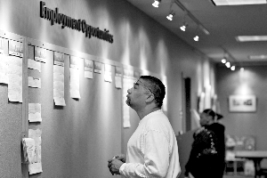| 在金融危機影響下,失業(yè)潮從美國刮到了歐洲,G20力圖通過舉辦金融峰會,合力開出全球經(jīng)濟藥方。圖為美國丹佛市一名男子正在失業(yè)救濟中心查閱告示