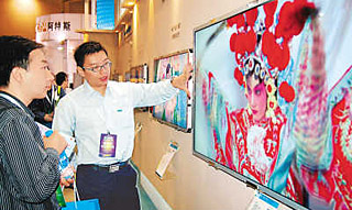 | 在2008中國(guó)蘇州電子信息博覽會(huì)上,一名工作人員向參觀者介紹超薄新款電視機(jī)。朱桂根
