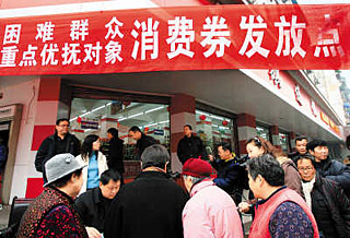 | 成都金牛區(qū)撫琴社區(qū)的部分困難群眾正在領(lǐng)取成都市發(fā)放的消費(fèi)券。CFP供圖 | 價(jià)值3791萬(wàn)元的消費(fèi)券,發(fā)放給30余萬(wàn)困難群眾,能否達(dá)到刺激消費(fèi)、擴(kuò)大內(nèi)需的政策效果?成都市發(fā)放消費(fèi)券的措施,近日引起了社會(huì)廣泛關(guān)注。