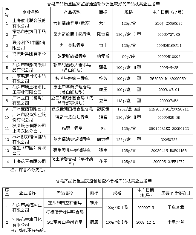 據(jù)國家質(zhì)檢總局網(wǎng)站,國家質(zhì)檢總局日前對香皂產(chǎn)品質(zhì)量進(jìn)行國家監(jiān)督抽查,產(chǎn)品抽樣合格率達(dá)95.9%。 本次抽查覆蓋北京、上海、江蘇、浙江、安徽、吉林、湖北、廣西、廣東等9個省和直轄市,共抽查了43家企業(yè)生產(chǎn)的73種產(chǎn)品。抽查中發(fā)現(xiàn)的主要質(zhì)量問題是香皂中的干皂含量未達(dá)到標(biāo)準(zhǔn)要求。