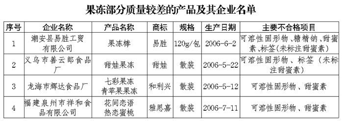 茶葉產(chǎn)品抽查中發(fā)現(xiàn)的主要質量問題為部分產(chǎn)品衛(wèi)生指標不合格、質量等級不符合標簽標注不規(guī)范。罐頭產(chǎn)品抽查中發(fā)現(xiàn)的主要質量問題是個別產(chǎn)品檢出二氧化硫。果凍產(chǎn)品抽查中發(fā)現(xiàn)的主要質量問題是個別產(chǎn)品超限量超范圍使用甜味劑、部分產(chǎn)品可溶性固形物達不到標準要求以及標簽標注不規(guī)范。