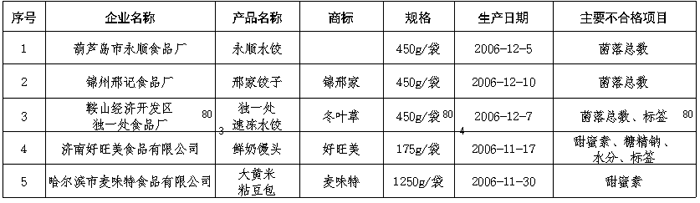 速凍面米食品部分質(zhì)量較差產(chǎn)品及其企業(yè)名單