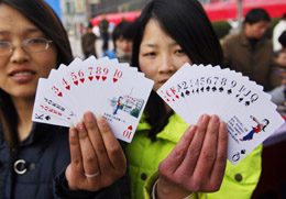 3月6日,兩名女青年在展示“外出務(wù)工婦女安全須知”宣傳撲克牌。當(dāng)日,安徽省“三八”維權(quán)月活動正式啟動。安徽省婦聯(lián)將開展“春風(fēng)送崗位”“送法律下鄉(xiāng)”等系列活動,重點對青年婦女和兒童進(jìn)行維權(quán)宣傳。