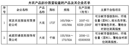 大衣產(chǎn)品抽查中發(fā)現(xiàn)的主要質(zhì)量問題有,個別產(chǎn)品含有禁用的可分解芳香胺染料;有部分產(chǎn)品面料、里料纖維含量不合格,主要是面料或里料的纖維含量明示標(biāo)識與實(shí)測結(jié)果不符,有的產(chǎn)品面料明示標(biāo)識為羊毛80%,駝毛20%,但實(shí)測結(jié)果為羊毛含量僅為50.3%,另有12%的兔毛和37.7%的腈綸;有部分產(chǎn)品耐水色牢度和干摩擦色牢度不合格,這樣的產(chǎn)品在穿著過程中,如遇到汗?jié)n、雨水等會使面料褪色。