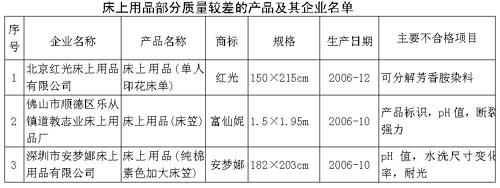 床上用品抽查中發(fā)現(xiàn)的主要質(zhì)量問題有,首先,強(qiáng)制性國家標(biāo)準(zhǔn)規(guī)定對服裝用和裝飾用紡織產(chǎn)品禁用可分解芳香胺染料,可分解芳香胺染料是關(guān)系到使用者人身健康安全的指標(biāo),抽查中有個別產(chǎn)品含有禁用的可分解芳香胺染料。其次,強(qiáng)制性國家標(biāo)準(zhǔn)規(guī)定,直接接觸皮膚類產(chǎn)品的pH值應(yīng)在4.0至7.5范圍內(nèi),抽查中有部分產(chǎn)品pH值超過國家標(biāo)準(zhǔn)規(guī)定的要求,pH值呈堿性。再次,斷裂強(qiáng)力和水洗尺寸變化率項(xiàng)目是衡量床上用品使用性能的主要指標(biāo),抽查中發(fā)現(xiàn)有部分產(chǎn)品斷裂強(qiáng)力和水洗尺寸變化率不合格。另外,抽查中有部分產(chǎn)品標(biāo)識標(biāo)注不規(guī)范,主要是沒有標(biāo)注產(chǎn)品基本安全類別、標(biāo)準(zhǔn)編號、產(chǎn)品等級等。