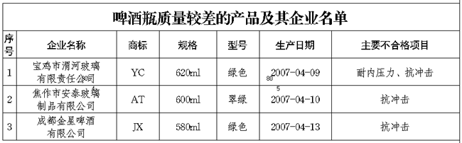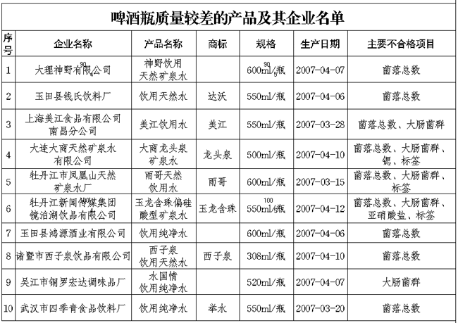 日前,國家質(zhì)檢總局對啤酒瓶及瓶裝飲用水產(chǎn)品質(zhì)量進(jìn)行了國家監(jiān)督抽查,產(chǎn)品抽樣合格率分別為86.2%和87.2%。 對啤酒瓶行業(yè)抽查主要包括理化指標(biāo)和標(biāo)志指標(biāo)。涉及的主要理化指標(biāo)為:內(nèi)應(yīng)力、抗沖擊、耐內(nèi)壓力和垂直軸偏差。標(biāo)志指標(biāo)主要是為防止不耐壓的非啤酒專用瓶用來灌裝啤酒,國家標(biāo)準(zhǔn)規(guī)定在瓶底以上20mm范圍打有啤酒瓶專用標(biāo)記“B”和生產(chǎn)企業(yè)的標(biāo)記,生產(chǎn)的年、季。經(jīng)檢驗,標(biāo)志指標(biāo)項目全部合格。但部分啤酒瓶抗沖擊力能力達(dá)不到國家標(biāo)準(zhǔn)規(guī)定的要求,抗沖擊力能力差的啤酒瓶在罐裝啤酒后,受到某種外力作用時,可能會發(fā)生啤酒瓶爆炸。另外,部分啤酒瓶耐內(nèi)壓力達(dá)不到國家標(biāo)準(zhǔn)規(guī)定的要求,耐內(nèi)壓力差的啤酒瓶在盛裝啤酒后,在生產(chǎn)、運(yùn)輸和使用過程中,會因輕微碰撞而引起爆炸,也有可能發(fā)生自爆。 瓶裝飲用水行業(yè)抽查中發(fā)現(xiàn)的主要質(zhì)量問題有,首先,菌落總數(shù)、大腸菌群超標(biāo)。菌落總數(shù)、大腸菌群是反映飲用水衛(wèi)生質(zhì)量狀況的重要指標(biāo)。菌落總數(shù)、大腸菌群的高低,表明飲用水受污染的程度。抽查中有部分產(chǎn)品菌落總數(shù)、大腸菌群超標(biāo),其中有一種飲用天然礦泉水產(chǎn)品菌落總數(shù)超過國家標(biāo)準(zhǔn)規(guī)定的要求400倍;有一種飲用水產(chǎn)品大腸菌群為國家標(biāo)準(zhǔn)值的七倍。其次,電導(dǎo)率不合格。電導(dǎo)率是反映飲用純凈水去離子程度的重要指標(biāo),也是衡量飲用純凈水純凈程度的特征指標(biāo)。抽查中有一種產(chǎn)品電導(dǎo)率為國家強(qiáng)制標(biāo)準(zhǔn)的兩倍多。另外,個別產(chǎn)品亞硝酸鹽超標(biāo)。亞硝酸鹽是反映飲用水產(chǎn)品質(zhì)量的污染物指標(biāo)之一。抽查中有一種飲用天然礦泉水產(chǎn)品亞硝酸鹽為國家標(biāo)準(zhǔn)規(guī)定值的五倍。抽查中還發(fā)現(xiàn)有部分產(chǎn)品標(biāo)簽標(biāo)注不規(guī)范,主要是陽離子、陰離子的含量范圍及溶解性總固體標(biāo)注不規(guī)范等。