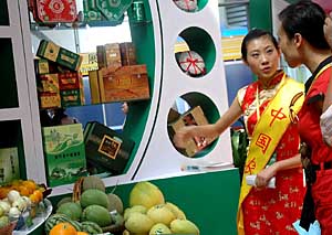 | 10月28日,第四屆中國(guó)-東盟博覽會(huì)上,中國(guó)廣西農(nóng)墾集團(tuán)工作人員向客人介紹中國(guó)綠色農(nóng)產(chǎn)品。新華社發(fā)(楊紹功