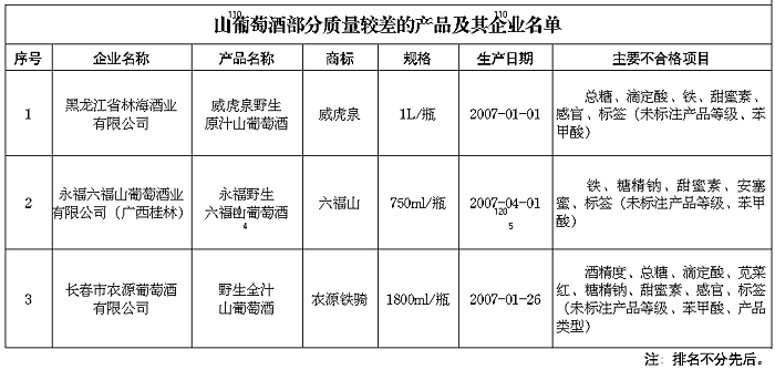 日前,國家質(zhì)檢總局在對(duì)山葡萄酒產(chǎn)品質(zhì)量的抽查中,共檢查了吉林、遼寧、黑龍江、廣西等四個(gè)省、自治區(qū)50家企業(yè)生產(chǎn)的50種產(chǎn)品(不涉及出口產(chǎn)品),產(chǎn)品實(shí)物質(zhì)量合格率為88%。 此次抽查對(duì)山葡萄酒產(chǎn)品的酒精度、總糖、滴定酸、揮發(fā)酸、游離二氧化硫、總二氧化硫、干浸出物、鐵、大腸菌群、細(xì)菌總數(shù)、腸道致病菌、鉛、莧菜紅、胭脂紅、山梨酸、苯甲酸、糖精鈉、甜蜜素、安塞蜜、感官以及標(biāo)簽等21個(gè)項(xiàng)目進(jìn)行了檢驗(yàn)。 抽查結(jié)果表明,一是連續(xù)多年的國家監(jiān)督抽查促進(jìn)了企業(yè)質(zhì)量意識(shí)的提高,此次產(chǎn)品抽樣合格率比上次提高了12個(gè)百分點(diǎn);二是所檢產(chǎn)品衛(wèi)生指標(biāo)中的大腸菌群、細(xì)菌總數(shù)、腸道致病菌項(xiàng)目全部合格。 抽查中發(fā)現(xiàn)的主要質(zhì)量問題: