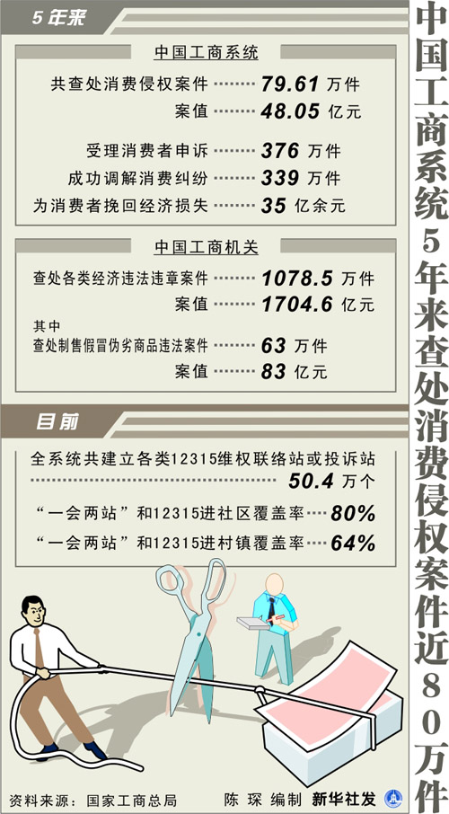 工商系統(tǒng)5年查處消費(fèi)侵權(quán)案近80萬(wàn)件