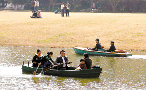 春天來了,游客在松江方塔公園內(nèi)蕩起小舟。沈家善 攝