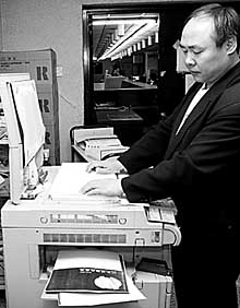 4月15日,國(guó)家圖書(shū)館第一復(fù)制室工作人員在為讀者復(fù)印圖書(shū)資料。自3月下旬以來(lái),國(guó)家圖書(shū)館全面調(diào)整復(fù)印費(fèi),其中,A4紙由每張0.5元下調(diào)到0.3元,B4紙由每張0.6元下調(diào)到0.4元。本報(bào)記者
