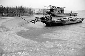 記者走到湖邊,看到了驚人的一幕:湖邊大約一二百平方米的范圍內(nèi),都被藍(lán)、綠、黑、灰等顏色覆蓋,湖面散發(fā)著一股惡臭,有些地方已經(jīng)看不到水面,都已經(jīng)凝固成塊,如同糞坑一般,上面停留著不少蒼蠅在嗡嗡地吞噬著污物。3艘漁船?吭诎哆,但很顯然早已派不上用場(chǎng)。湖邊倒也有不少蘆葦,但蘆葦?shù)那o部已經(jīng)被藍(lán)綠色的污染物染上顏色。偶爾有幾只水鳥(niǎo)從湖面飛過(guò),但卻始終找不到落腳點(diǎn),而不得不飛向遠(yuǎn)處。