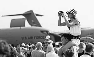 圖為8月25日在航空航天展覽會(huì)上,一名參觀者拍攝美軍飛機(jī)。新華社記者 沈伯韓