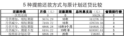 第五種,部分提前還款,增加月供,縮短還款期限。 提前還款10萬元,月供增加為9474.29元,還款期限縮短為10年,提前還款后總利息為311278.35元。 利息總額=30129.9+281148.45=311278.35元 業(yè)內(nèi)人士分析指出,縮短貸款期限是節(jié)省利息的關(guān)鍵因素。從上述計算結(jié)果來看,還款期限15年與10年相比總利息支出相差近16萬多元。而還款期限20年與10年相比更是多支付了高達(dá)42萬多元的利息,這筆費(fèi)用對于一個工薪家庭來講還是相當(dāng)可觀的。因此房貸消費(fèi)者一定要重視較長的還貸年限所帶來的高額利息支出,根據(jù)自身經(jīng)濟(jì)情況盡量縮短還款年限,從而減少利息支出。 |