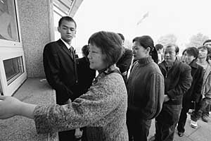 “上午3500,下午1500”,記者看到,在博物館門前發(fā)票處的窗口上,醒目地貼著每日參觀票的發(fā)放限額。當(dāng)日下午兩點(diǎn)半左右,博物館“下半場(chǎng)”開始,參觀者排著整齊的隊(duì)伍有序進(jìn)場(chǎng),當(dāng)門前還有三四十人時(shí),發(fā)票暫停。保安解釋說:“3點(diǎn)鐘再發(fā),控制一下人數(shù)。”排隊(duì)的人們都心平氣和地等著,或翻看報(bào)紙,或三五成群地聊天。