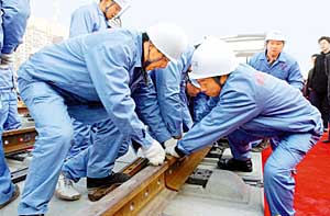 一般來(lái)說(shuō),23攝氏度是鋼軌鎖定的最佳溫度,可是工程恰好趕在了寒冬!皻鉁氐蛯(duì)我們鋼軌鎖定技術(shù)提出了非常大的挑戰(zhàn),”中鐵二局股份公司副總經(jīng)理、京津城際項(xiàng)目部經(jīng)理王云波說(shuō),“我們?nèi)藶榘?500米的鋼軌拉伸了七八十厘米,再扣緊鎖定,由此保證了鋼軌一年四季的安全性。這在全世界都是絕無(wú)僅有的!