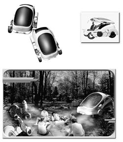 | 一輛汽車可以簡單分解成兩輛單人機車,外殼成了郊游的帳篷。 |