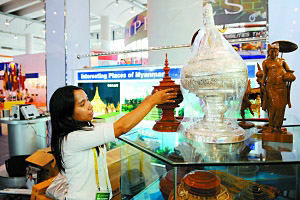 | 第五屆中國-東盟博覽會將于22日至25日在南寧舉辦,圖為來自泰國的一名客商在展位上布置參展的工藝品