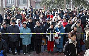 在北京某大學(xué)一考點外,許多家長在寒風(fēng)中等待參加全國英語等級考試(PETS)的孩子。在此參加考試的考生絕大多數(shù)是中小學(xué)生。本報記者 羅偉