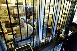 | 一名男子(右)在法國(guó)巴黎一家貨幣兌換處換錢。本報(bào)資料照片 | 美國(guó)將因金融監(jiān)管疏漏遭批