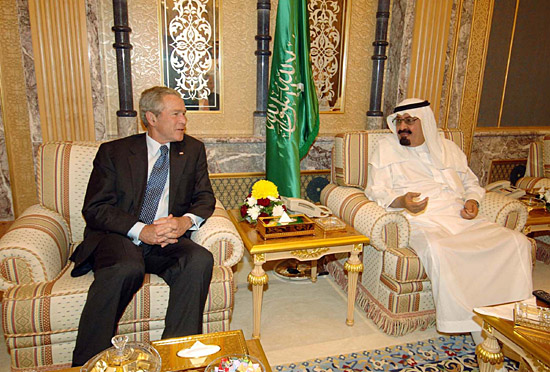| 沙特國(guó)王阿卜杜拉(右)日前在利雅得與美國(guó)總統(tǒng)布什主要就加強(qiáng)雙邊關(guān)系和國(guó)際油價(jià)、伊朗核計(jì)劃等共同關(guān)心的熱點(diǎn)問(wèn)題進(jìn)行了探討。新華社/沙特通訊社 |