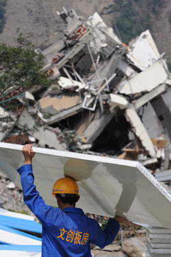 | 6月5日,工人們在汶川映秀鎮(zhèn)加緊建設(shè)活動板房。新華社記者 武巍