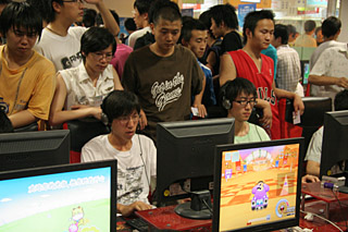 網(wǎng)吧里擠滿了玩電子游戲的年輕人。王振
