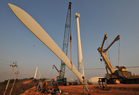 工程人員在江西九江市廬山區(qū)海會鎮(zhèn)長嶺風(fēng)電場吊裝一座風(fēng)力發(fā)電機(jī)。本報記者:章武