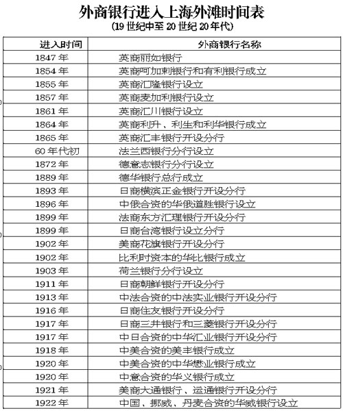 高樓大廈林立的上海外灘,是鴉片戰(zhàn)爭以來外資進(jìn)入的一個縮影,在這塊彈丸之地上幾乎集中了上海所有的外資銀行,故而當(dāng)時將外資銀行稱作“外灘銀行”。 外資銀行很早就進(jìn)入了上海,與此相比,華資銀行的產(chǎn)生則整整晚了半個世紀(jì)。鴉片戰(zhàn)爭后,依據(jù)不平等的《中英南京條約》,上海等五個東南沿海城市被辟為通商口岸。上海開埠后的第四年即1847年,英商麗如銀行率先搶灘上海。在隨后的70多年中,以英國資本為主導(dǎo),包括法國、德國、日本、俄國、美國等國資本在內(nèi)的30余家銀行陸續(xù)在上海登陸(詳見外商銀行進(jìn)入上海外灘時間表)。 這些銀行主要集中在從延安東路外灘到北京東路外灘,形成了上海的金融中心。各銀行為了顯示資本的雄厚,都在建筑外觀上追求各自獨特的風(fēng)格,有哥特式、巴洛克式、羅馬式、中西合璧式等等。 由于外灘附近匯集了各國頗具實力的銀行,比如英國匯豐銀行、德國德華銀行、美國華旗銀行等,使外灘成為名副其實的“東方華爾街”。