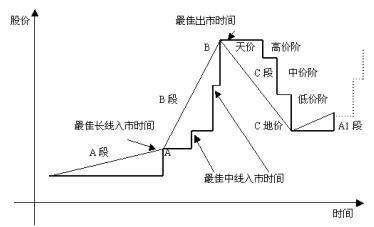 圖2-27A-B-C循環(huán)趨勢線 B趨勢線的橫坐標(biāo)記錄了B段經(jīng)歷的天數(shù),縱坐標(biāo)記錄了股價的變動,縱坐標(biāo)與橫坐標(biāo)之比記錄了股價上升的斜率。把經(jīng)歷B段天數(shù)的日成交量累加可計算出換手率和總成交量。通過軟件的特別功能,可計算出持股人數(shù)變化比。 C趨勢線的橫坐標(biāo)記錄了C段經(jīng)歷的天數(shù),縱坐標(biāo)記錄了股價的變動,縱坐標(biāo)與橫坐標(biāo)之比記錄了股價下降的斜率。把經(jīng)歷C段天數(shù)的日成交量累加可計算出換手率和總成交量。通過軟件可計算出持股人數(shù)變化比。 從入市風(fēng)險來研究,A趨勢線的入市風(fēng)險最小,B趨勢線次之,C趨勢線風(fēng)險最大。 “風(fēng)險入市法”規(guī)定,C趨勢線和B趨勢線的高價臺階是高風(fēng)險時間段和高風(fēng)險臺階,也是中長線投資者禁止入市的時間段和臺階。 A-B-C循環(huán)趨勢線能提供給投資者最佳的入市時間。入市的最佳時間是B趨勢線的起始點的前后幾個交易日;A-B-C循環(huán)趨勢線給出了最佳出市時間,出市的最佳時間是C趨勢線起始點前后幾個交易日。 如圖2-28所示,A-B-C循環(huán)趨勢線加上每一段的臺階式走勢可以告訴您當(dāng)前股票在哪一段或哪一個臺階上運行的精確位置,并借助計算機的幫助,可以知道未來股市的準(zhǔn)確走勢。 這種兩級劃分方法使股價走勢圖形更加清晰、清楚。絕大部分投資者所關(guān)心的是股市當(dāng)天和未來的走勢。所以,對當(dāng)前和未來的走勢要細(xì)分,而對過去的走勢可粗分。 圖2-28清楚地告訴投資者當(dāng)前股票處在走勢中的準(zhǔn)確位置,準(zhǔn)確地告訴投資者最佳入市段、入市階、最佳出市段和出市階。 圖2-28A-B-C循環(huán)趨勢線和各段臺階式走勢示意圖 A-B-C循環(huán)趨勢線為計算機提供準(zhǔn)確的數(shù)據(jù)取樣點和時間周期。通過對這個時間周期所定義的大量數(shù)據(jù)進行分析、整理、比較和計算,可以準(zhǔn)確地了解到莊家和跟莊者的持股數(shù)量、操盤手法和A、B、C各段所發(fā)生的準(zhǔn)確時間以及持續(xù)的長度,從而得到準(zhǔn)確的入市時間和出市時間。