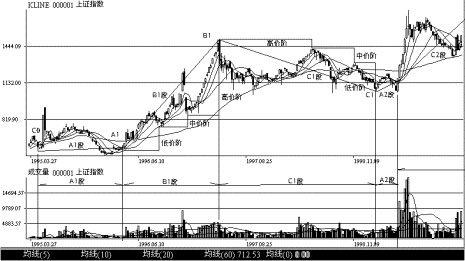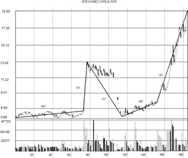 (二)上證指數(shù)三段三階的實戰(zhàn)劃分 圖2-34是上海股票市場大盤上證指數(shù)(1995年3月至2000年4月)的周K線和成交量走勢圖。 在圖2-34中: ●C0至A1組成A段。A段是莊家和跟莊者秘密收集籌碼階段,股指在低位盤整,成交量比前期放大但仍呈萎縮狀況,持續(xù)時間一年。 ●A1至B1組成B段。成交量比前期放大,經(jīng)常出現(xiàn)天量,股價呈低、中、高三臺階式上升,這是莊家和跟莊者大量吸進籌碼,拉高股價階段。持續(xù)時間1年零3個月。 ●B1至C1組成C段。這是莊家和跟莊者派貨階段,成交量比B段萎縮,股價呈高、中、低三臺階式下降,持續(xù)時間2年。 ●C0至C1組成第一個A-B-C三階循環(huán)趨勢線,持續(xù)時間約4年。 ●C1至A2組成第二個A段,持續(xù)時間4個月后,另一個三階循環(huán)趨勢線開始。 圖2-34上證指數(shù)三段三階的劃分 ●在A-B-C三循環(huán)趨勢線的劃分中,A段起始點的確定有一定難度。在后面的章節(jié)作進一步介紹。 ●圖2-34是上證指數(shù)大盤的走勢。大盤的走勢代表了大部分上海個股的走勢,是個股走勢的集合。這充分說明A-B-C三循環(huán)趨勢線分析方法的正確性,是股票走勢的共性。 ●股價是疊加在A-B-C三階循環(huán)趨勢線的隨機過程。 九、深滬二地個股三段三階劃分的案例 (一)深圳股票深寶安(0009) 圖2-35是深圳股票深寶安(0009)1995年7月至2000年5月的周K線和成交量走勢圖。 在圖2-35中: ●A至B組成B段。成交量比前期放大,經(jīng)常出現(xiàn)天量,股價呈低、中、高三臺階式上升,這是莊家和跟莊者大量吸進籌碼,投機拉高股價階段。B段持續(xù)時間約一年。 圖2-35深圳股票深寶安三段三階的劃分 ●B1至C1組成C段。這是莊家和跟莊者派貨階段,成交量比B段極度萎縮,股價呈高、中、低三臺階式下降,C段持續(xù)時間約兩年6個月。 ●C至A1組成第二個A段。成交量從萎縮到開始放大,持續(xù)時間7個月后,另一輪三循環(huán)趨勢線開始。 (二)上海股票上海石化(600689) 圖2-36是上海股票上海石化(600689)1995年7月至2000年5月的周K線和成交量走勢圖。 在圖2-36中: ●A至B組成B段。成交量比前期放大,經(jīng)常出現(xiàn)天量,股價呈低、中、高三臺階式上升,這是莊家和跟莊者大量吸進籌碼,拉高股價階段。B段持續(xù)時間約兩年。 ●B1至C1組成C段,是莊家和跟莊者的派貨階段,成交量極度萎縮,股價呈高、中、低三臺階式下降。C段持續(xù)時間約二年。 ●C至A1組成第二個A段。成交量從萎縮到開始放大。A段的持續(xù)時間約10個月。另一輪三循環(huán)趨勢線又開始。 圖2-36上海股票上海石化三段三階的劃分 十、理想的A-B-C三段循環(huán)走勢 (一)模擬理想的A-B-C三段循環(huán)走勢 圖2-37是理想的A-B-C三階循環(huán)走勢圖。這個走勢圖是從實際出發(fā),根據(jù)多張走勢圖形總結(jié)出的一個理想的A-B-C三段循環(huán)走勢圖形。這個走勢圖形也是股市操盤手追求的走勢,能用最少的成本給莊家和跟莊者帶來最大的利潤。 圖2-37模擬理想的A-B-C三段循環(huán)走勢圖 A段走勢是一個低價位的箱形震蕩走勢,股價波動在15%左右,每日成交均量和換手率在1%左右。這樣的股價變動和成交量不影響股價的向上攀升。100個交易日換手率在100%。通過換手,莊家和跟莊者收購了大量的籌碼。從圖中成交量顯示,莊家和跟莊者控制了45%以上的流通籌碼。 B段走勢是一條幾乎垂直的上升斜線。四個交易日,股價上漲了(13.02–6.5)/6.5×100%=100%,達到階段性天量,B段 結(jié)束,C段開始。 上圖的C段走勢,頭28個交易日是一個高位直角三角形震蕩走勢。三角形的直邊是股價的最大變動值,該值在高位11.22元~13.02元約16%之間波動。每日的成交均量和換手率在4%左右,相當(dāng)于莊家和跟莊者每日向市場派4%(其中部分是散戶的籌碼)左右的籌碼。很顯然,這是莊家和跟莊者最理想的派貨走勢。高價派貨股價不降,28個交易日總成交量和換手率達110%以上,說明莊家和跟莊者在低位買進的籌碼在高位已基本派完。 第29個交易日,莊家和跟莊者用所;I碼把股價打壓,連續(xù)7個交易日股價呈無量下跌(低位無人接貨)走勢。股價從13.02元降到5.85元。跌幅(5.85–13.02)/13.02×100%=–55%,絕對值7.17元。股價打回原形達到地價,C段結(jié)束,A段 走勢開始,又開始了新一輪三段三階走勢。 圖2-37顯示了理想的三階循環(huán)走勢。在實戰(zhàn)中,A段和B段的圖形走勢是容易做到的。特別是當(dāng)莊家和跟莊者收購了流通股的80%后就可以做出任何拉升走勢。有時可在一個交易日內(nèi)把股價拉升200%。但在高位如何把手中所控的籌碼賣出,達到理想的C階走勢是很難做到的。