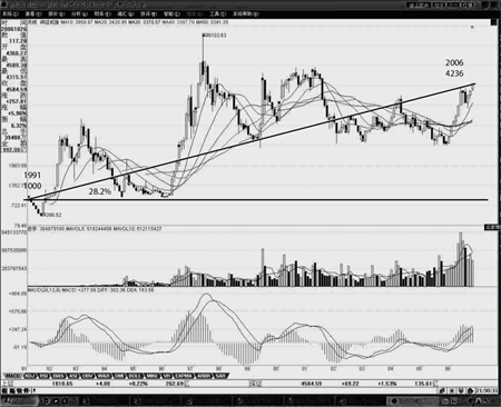 圖4深成指1991年-2006年的實際走勢 圖4深成指15年的走勢(1991-2006)