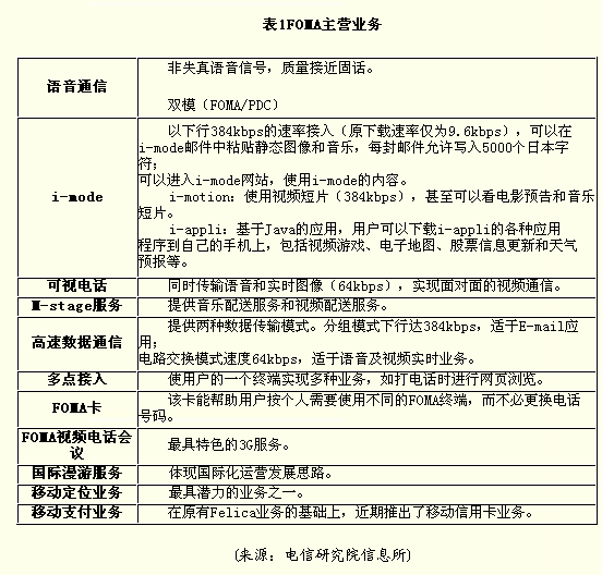 DoCoMo在3G市場(chǎng)推出的品牌是FOMA,其在運(yùn)營(yíng)方面最大的特點(diǎn)是與其2G的i-mode業(yè)務(wù)緊密結(jié)合,使得FOMA的數(shù)據(jù)業(yè)務(wù)不僅從其原有PDC網(wǎng)絡(luò)i-mode數(shù)據(jù)業(yè)務(wù)獲得了繼承,而且在原有i-mode的基礎(chǔ)上增強(qiáng)了許多功能。NTT