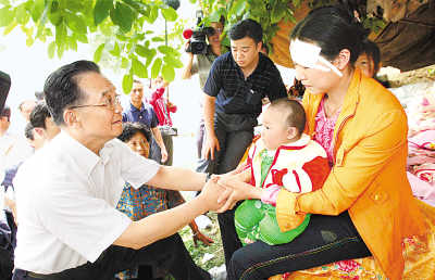 五月十五日,中共中央政治局常委、國(guó)務(wù)院總理溫家寶輾轉(zhuǎn)趕到位于四川北部的青川縣木魚鎮(zhèn)看望受災(zāi)群眾。這是溫家寶在木魚鎮(zhèn)文武村安慰在地震中幸存的母子。 新華社記者 姚大偉攝