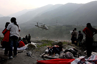| 5月15日,映秀鎮(zhèn)的受傷群眾在等待著解放軍直升機的營救。 |
