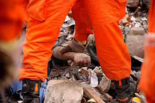 綿竹市漢旺鎮(zhèn),距離汶川地震震中直線距離約30公里,災情十分嚴重,海軍陸戰(zhàn)隊2750多名官兵于16日凌晨4時趕到漢旺鎮(zhèn)后,立即展開救援行動。我得到消息后,馬上以最快的速度走出映秀鎮(zhèn),經成都轉戰(zhàn)漢旺災區(qū)。 17日下午,我終于趕到漢旺鎮(zhèn)東汽中學救援現(xiàn)場,陸戰(zhàn)隊官兵已經在這里奮戰(zhàn)多時,一邊配合消防隊的救援挖掘機清理廢墟,一邊繼續(xù)尋找遇難學生的遺體。 在現(xiàn)場的陸戰(zhàn)隊員告訴我說,大地震造成漢旺東方汽輪機廠的東汽中學和東汽技校倒塌,中學受災最為嚴重,至少有300多名中學生被埋在倒塌的瓦礫中。再就是漢旺煤礦的宿舍樓全部被毀,倒班休息的礦工們也沒有逃離厄運。 據(jù)資料顯示,漢旺曾是個美麗富饒的地方,是全國首批57個綜合改革試點鎮(zhèn)之一,全國500家小城鎮(zhèn)試點鎮(zhèn),全國生態(tài)環(huán)境及基礎設施建設試點鎮(zhèn),2001年榮獲全國創(chuàng)建文明城鎮(zhèn)示范點的光榮稱號。 可是,出現(xiàn)在我眼前的漢旺,卻是一片倒塌的廢墟,這里的人們已經失去了自己美好的家園。漢旺鎮(zhèn)約有60余座高層建筑,強震后幾乎沒有一座建筑完好。據(jù)說,地震發(fā)生時,漢旺鎮(zhèn)政府的領導正在開會,一名副鎮(zhèn)長由于遲到了5分鐘,僥幸活了下來,其他班子成員全都被掩埋在鎮(zhèn)政府大樓的廢墟里。當時,東方汽輪機廠車間里有上千名工人在上班,地震時廠房倒塌也都被壓在廢墟里。 在東汽中學,我目睹了救援人員尋找遇難學生遺體的悲壯場面。當一具具變形的遺體被從廢墟里抬出時,我明顯地感覺到現(xiàn)場的空氣在悲傷中凝固,令人窒息。盡管人們都戴著口罩,還是能夠聞到濃烈的氣味,非常難聞。 在漢旺鎮(zhèn)小學的操場上,擺放著幾十具剛剛挖出來的學生遺體,檢疫人員在進行逐一登記,家長們要在這里認領自己的孩子。這是個多么觸目驚心的場面!當家長們看到自己模糊不清的親生骨肉時,難以自禁地迸發(fā)出撕心裂肺的哭泣。面對此情此景,我淚流滿面,不忍心按下手中相機的快門。
