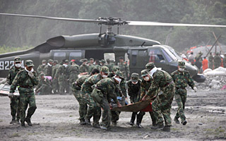 | 5月15日,解放軍救援部隊官兵在映秀鎮(zhèn)爭分奪秒搶救傷員。 | 5月12日,一個讓世界震驚的日子:中國四川省汶川縣發(fā)生8.0級特大地震。 災情就是命令,時間就是生命。 職業(yè)的敏感告訴我,這是當今中國最大的突發(fā)性災難事件,去抗災一線,刻不容緩。 5月14日13時30分,運輸機降落在成都雙流國際機場。我隨著海軍醫(yī)療隊的車隊,馬不停蹄,連夜向地震中心的汶川進發(fā)。