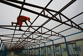 | 6月4日,一名工人在四川省什邡市洛水鎮(zhèn)搭建活動板房。新華社發(fā)(鐘敏
