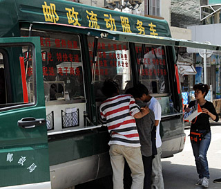| 汶川街頭出現(xiàn)郵政流動服務車。6月9日,人們在街頭的郵政流動服務車辦理郵政業(yè)務。新華社記者 唐召明
